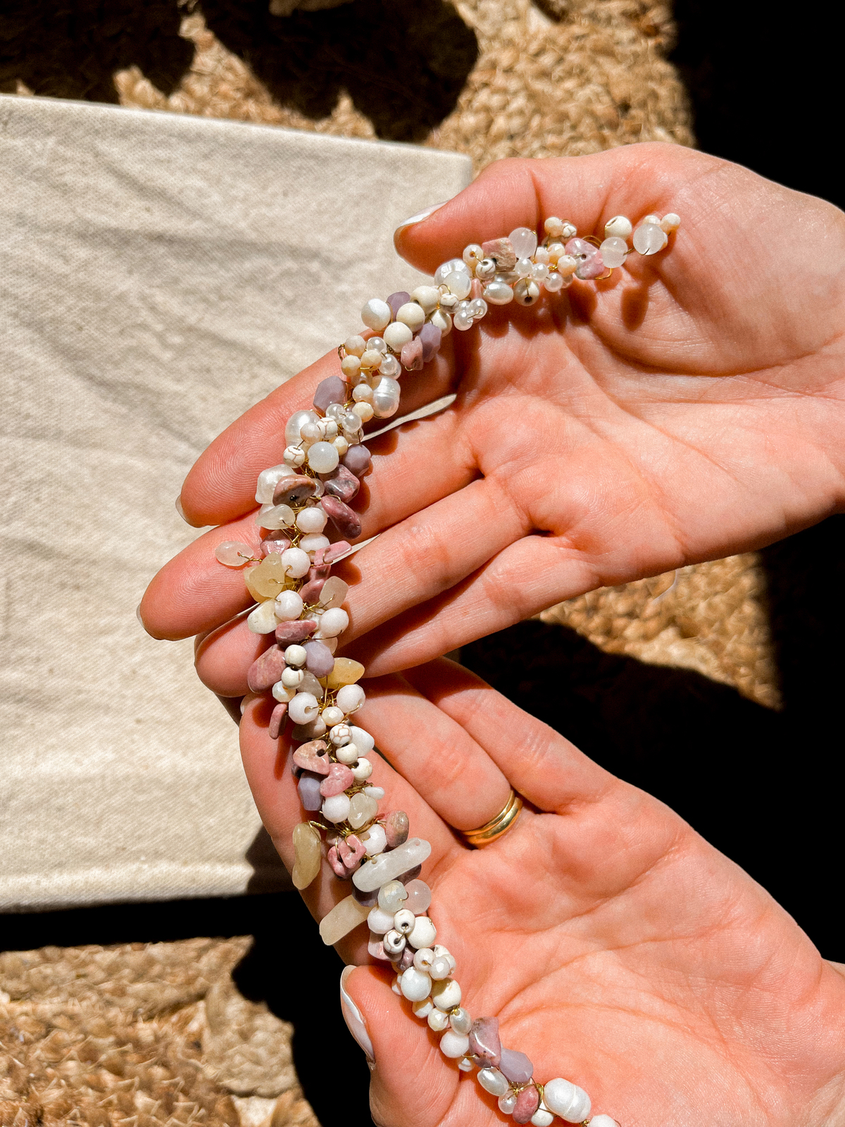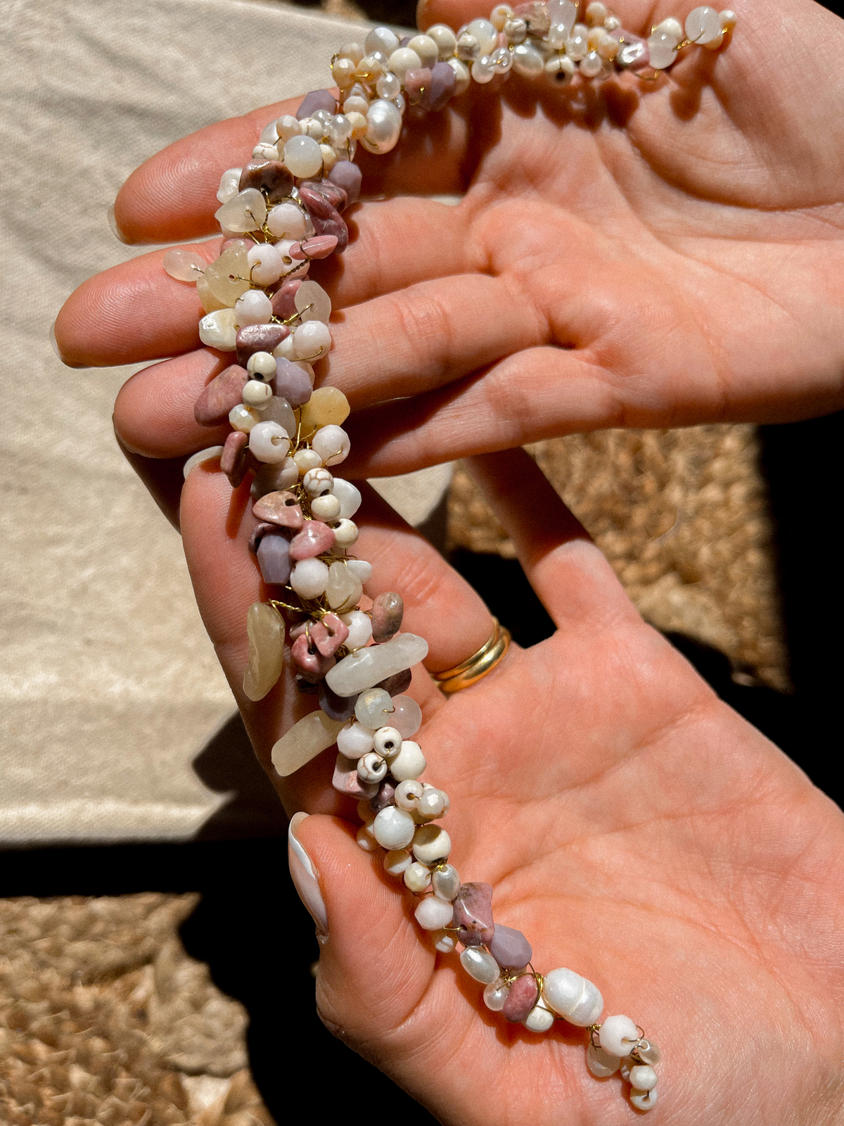 Piezas únicas, realizadas con pedrería, cristales, perlas de vidrio, strass y alambre de cobre.